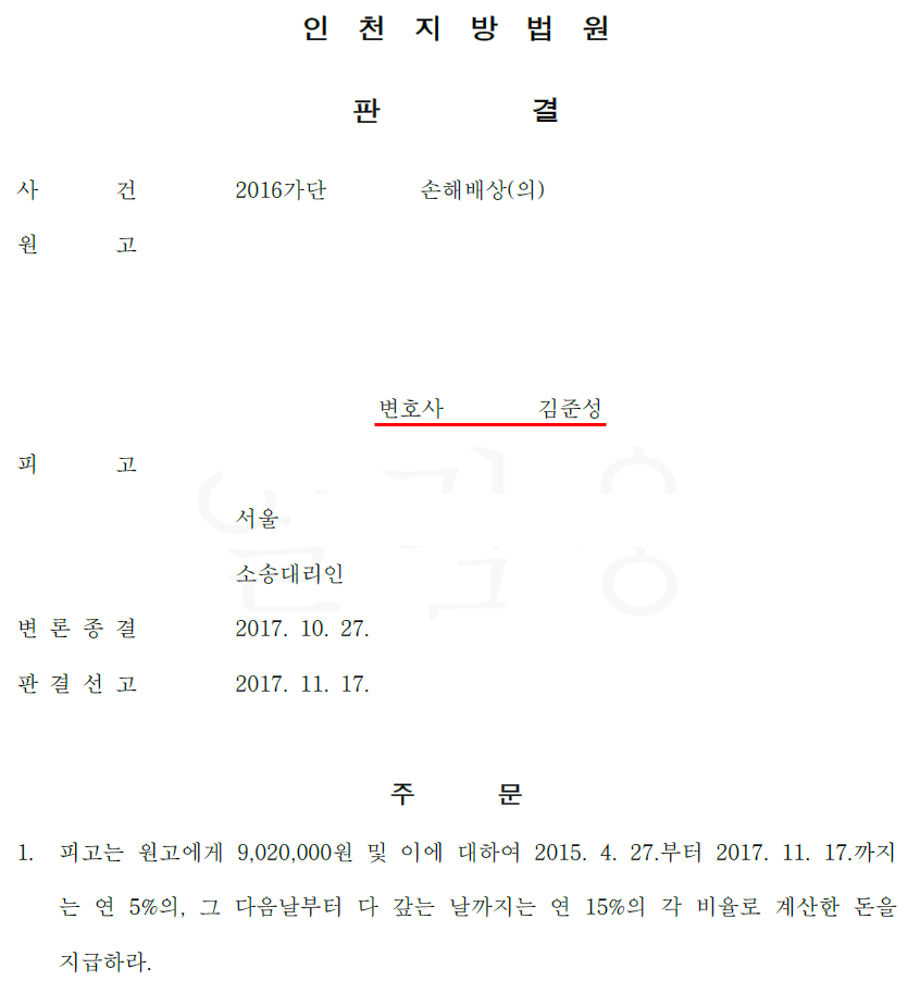 인천지방법원은 원고의 위 주장을 받아들여 피고는 원고에게 9,020,000원을 지급하라는 판결을 선고하였습니다.