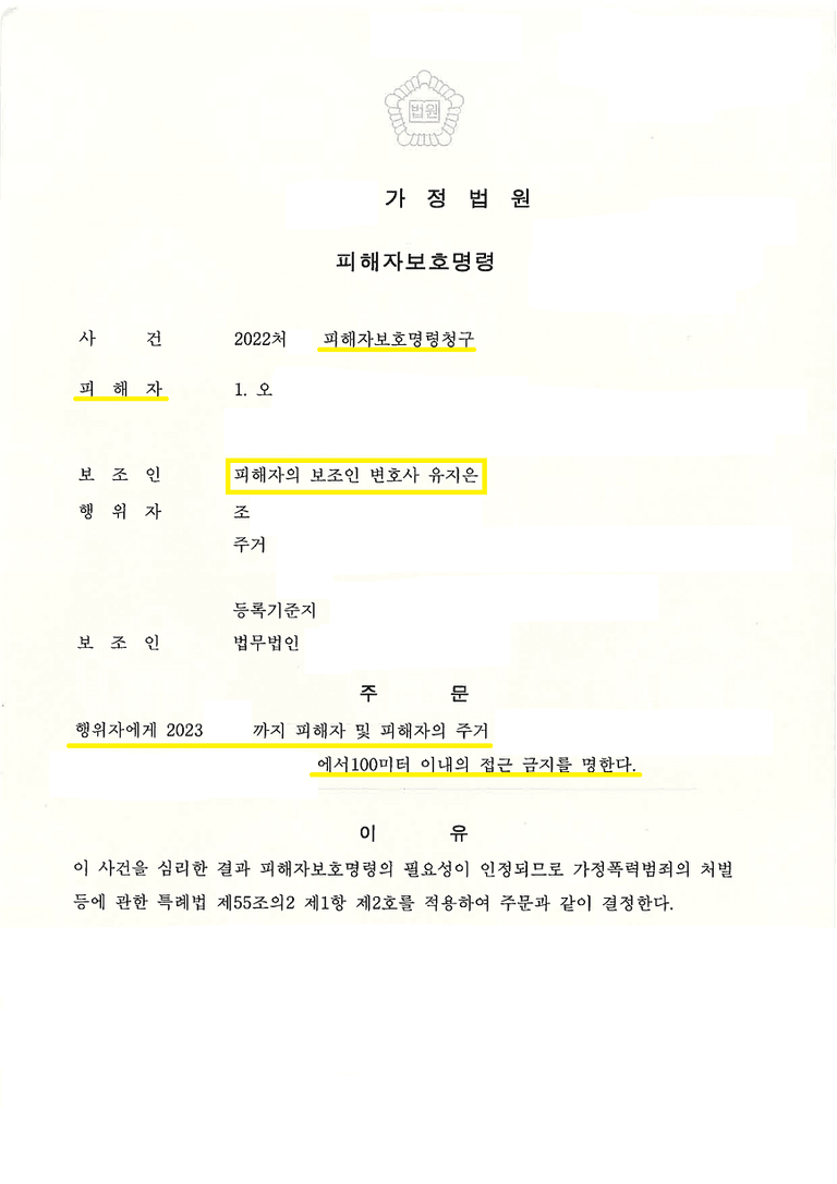 다행히 임시조치 기간이 끝나기 전에 1년간 피해자 및 피해자의 주거지에서 100미터 이내 접근금지를 명하는 내용으로 피해자보호명령이 나왔고, 피해자보호명령은 최장 2년 안에서 연장 신청이 가능한데, 추가로 6개월 연장을 더 받아드림으로써 그 안에 안전하게 이혼 소송을 마무리해드릴 수 있었습니다.