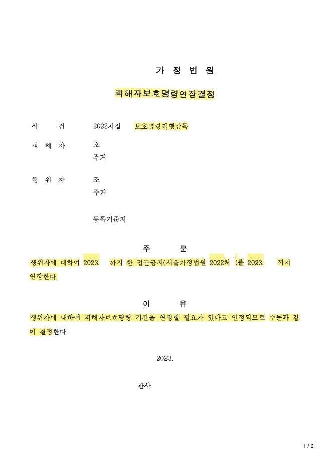 저희는 이혼 소송을 제기하면서 임시조치 연장신청을 하였고, 임시조치는 2개월씩 최장 6개월까지만 가능하므로 소송이 끝날때까지 의뢰인이 안전할 수 있도록 법원에 별도로 피해자보호명령 및 피해자보호명령 연장신청을 하였습니다.
