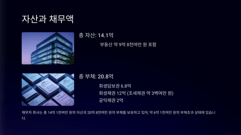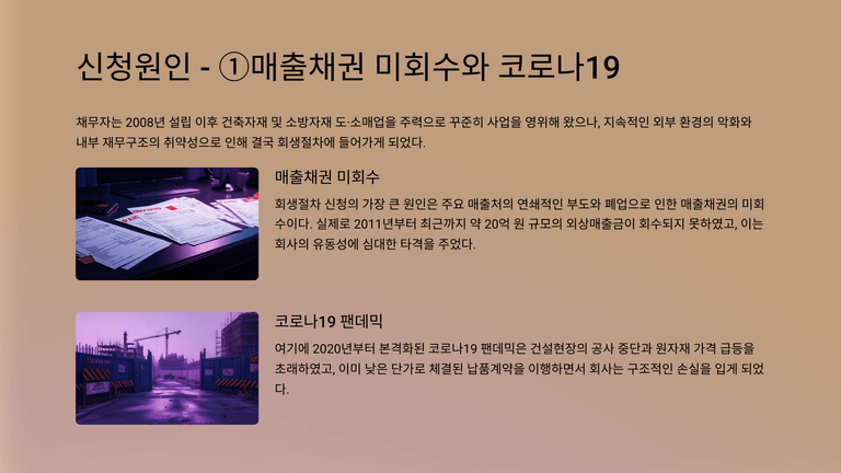 채무자는 2008년 설립 이후 건축자재 및 소방자재 도·소매업을 주력으로 꾸준히 사업을 영위해 왔으나, 지속적인 외부 환경의 악화와 내부 재무구조의 취약성으로 인해 결국 회생절차에 들어가게 되었다.