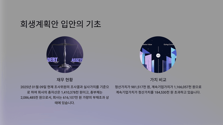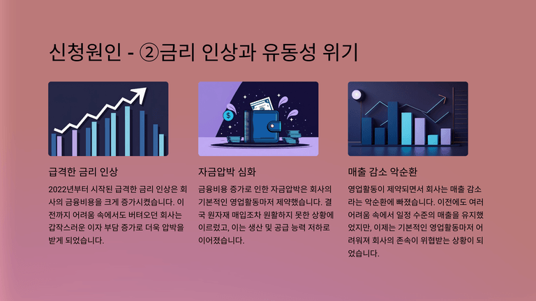 이러한 상황 속에서도 회사는 일정 수준의 매출을 유지하며 영업을 지속하였지만, 2022년부터 시작된 급격한 금리 인상은 금융비용을 크게 증가시켰고, 결국 자금압박으로 인해 원자재 매입조차 원활하지 못한 상황에 이르렀다. 그 결과 영업활동이 제약되고 매출은 다시 감소하는 악순환에 빠졌으며, 결국 2024년 말부터는 정상적인 사업의 지속 없이는 변제기 도래 채무를 감당할 수 없는 상태에 이르자, 이러한 유동성 위기를 극복하고 사업을 정상화하기 위해 법원에 간이회생절차를 신청하였다.