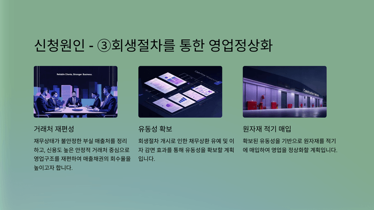 채무자는 이러한 회생절차를 통하여 ①재무상태가 불안정한 부실 매출처를 정리하고, 신용도 높은 안정적 거래처 중심으로 영업구조를 재편하여 매출채권의 회수율을 높이고, ②회생절차 개시로 인한 채무상환 유예 및 이자 감면 효과를 통해 유동성을 확보한 후, 이를 기반으로 원자재를 적기에 매입하여 영업을 정상화할 계획이었다.