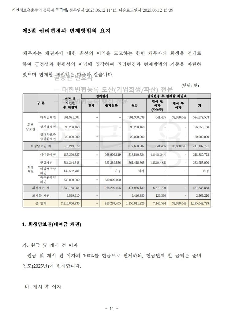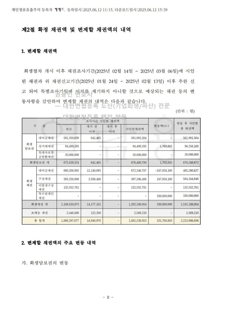 회생채권 : 12억 여만 원 (조세채권 : 3백여만 원)