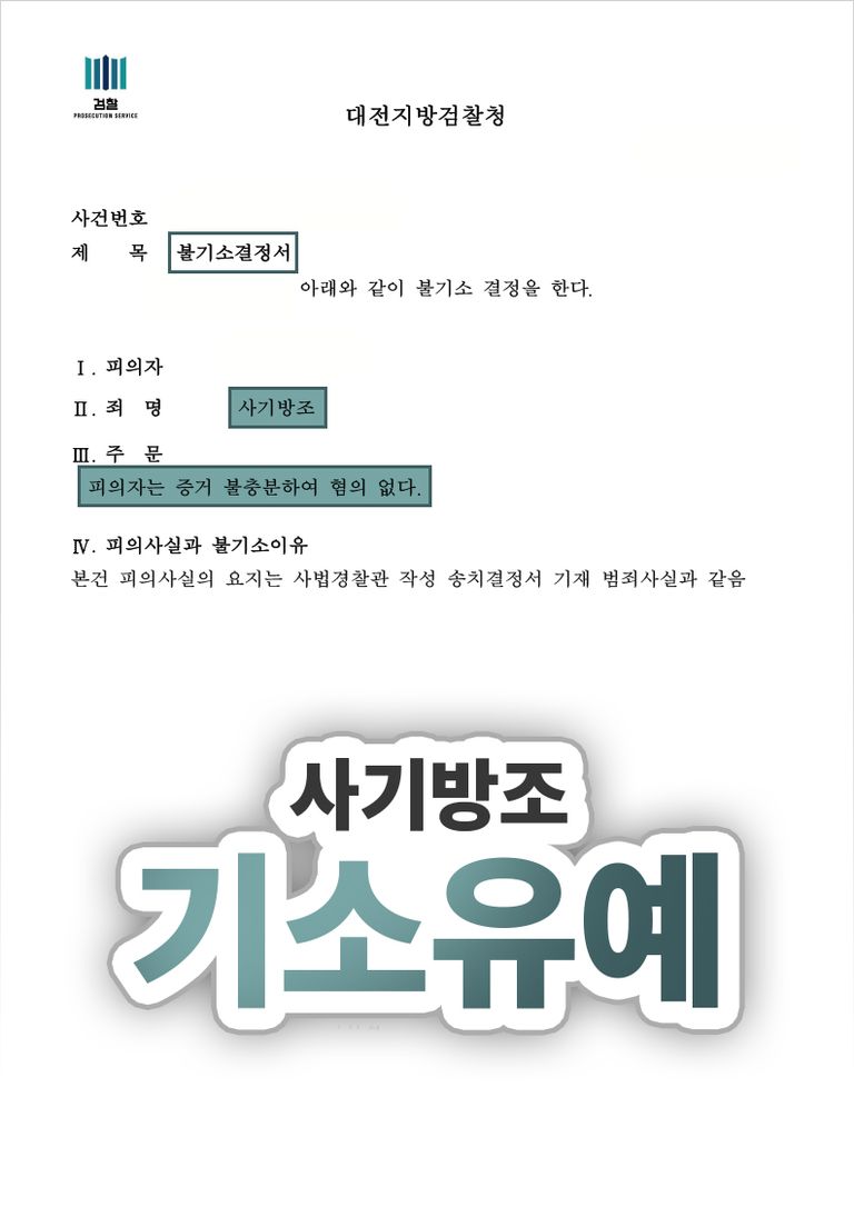 그 결과, 검찰은 의뢰인에게 ‘혐의없음’불기소 처분을 하였습니다.