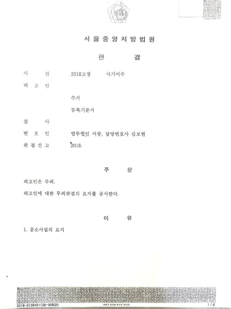 결국 법원은 무죄를 선고하였고, 검찰도 위 판결에 승복하여 항소하지 아니하여 무죄 판결이 확정됨.