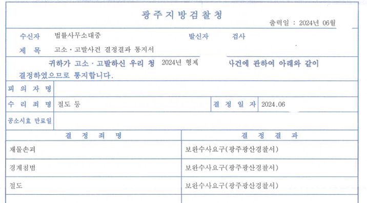 검찰은 재물손괴죄, 경계침범죄, 절도죄에 대하여 모두 재수사할 것을 요구하며 보완수사요구 명령 처분을 하였습니다.