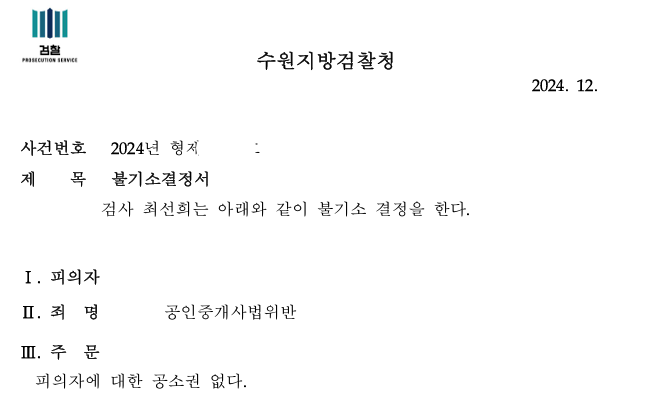 이에, 의뢰인은 검찰단계에서 공인중개사법위반 혐의에 대하여 불기소 처분(공소권없음)을 받을 수 있었고, 추가적인 형사 처벌없이 사건을 종결할 수 있었습니다.