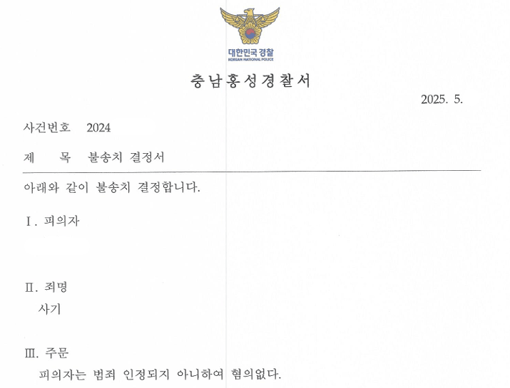 이에, 경찰 조사 단계에서 사기에 관하여 '혐의없음(증거불충분)'으로 불송치 결정을 받을 수 있었습니다.