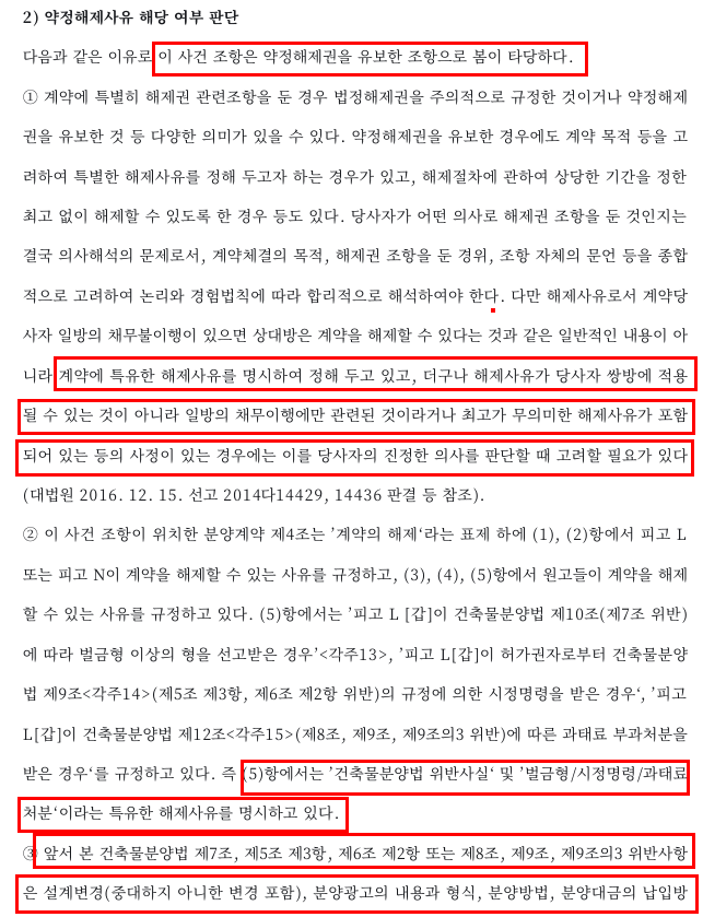 위와 같이 건분법위반계약해제 사유인 시정명령, 벌금형 이상의 형의 선고 확정, 과태료 처분은 약정해제 사유여서 법정해제권과 같은 계약목적 달성이 불가능한 경우라는 요건이 필요하지 않다는 것입니다. 위 판례 사안에서 법원은 시행사의 벌금형 이상의 형 선고가 확정되었고 수분양자들이 이를 사유로 계약해제 통보를 하여 계약은 해제되었다고 판단하였습니다.