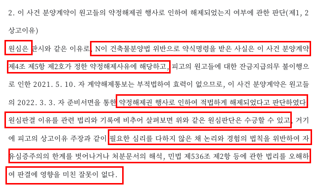 지난 포스트에 게시할 당시에 소개한 서울고등법원 2022나2018134 부당이득금 판결은 공급계약서에 정한 건분법 위반으로 벌금형 이상의 선고가 확정된 경우, 계약목적 달성이 어려운 경우인지와 상관없이 건분법위반계약해제가 인정된다고 판결하였는데요, 당시에는 대법원에 상고가 되어 아직 결과가 나오지 않았습니다.