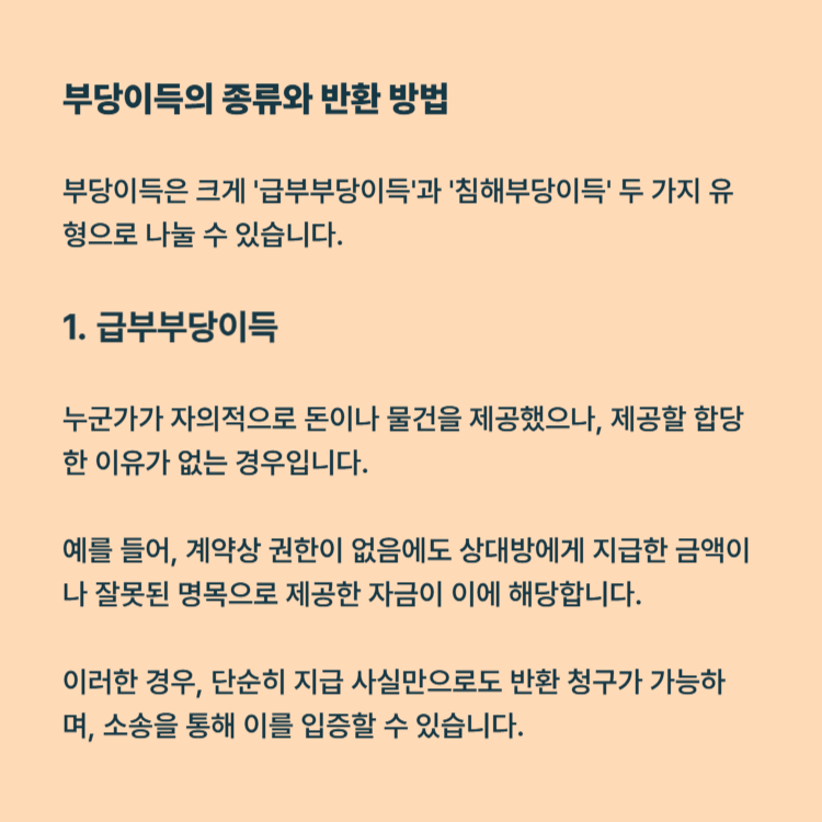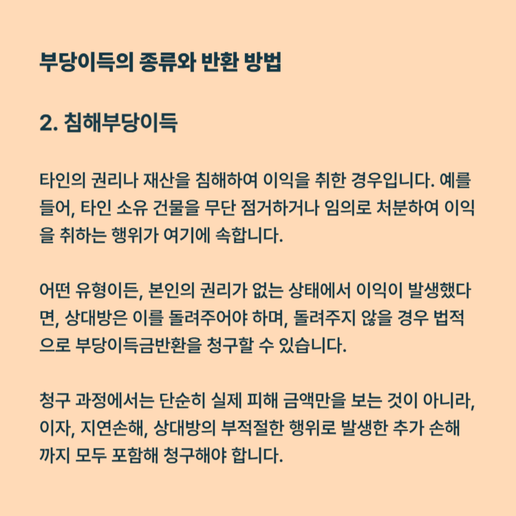 어떤 유형이든, 본인의 권리가 없는 상태에서 이익이 발생했다면, 상대방은 이를 돌려주어야 하며, 돌려주지 않을 경우 법적으로 부당이득금반환을 청구할 수 있습니다.