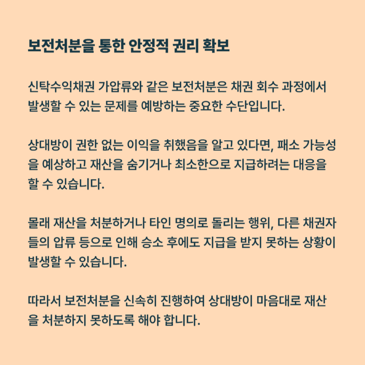 신탁수익채권 가압류와 같은 보전처분은 채권 회수 과정에서 발생할 수 있는 문제를 예방하는 중요한 수단입니다.