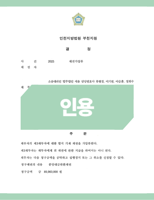 그 결과, A씨는 현금 공탁 없이 89,960,000원의 신탁수익채권 가압류를 안정적으로 확보할 수 있었습니다. 이후 분양계약을 해제하고 계약금을 반환받는 데 성공하며, 부당이득금 회수를 현실적으로 실현할 수 있었습니다.