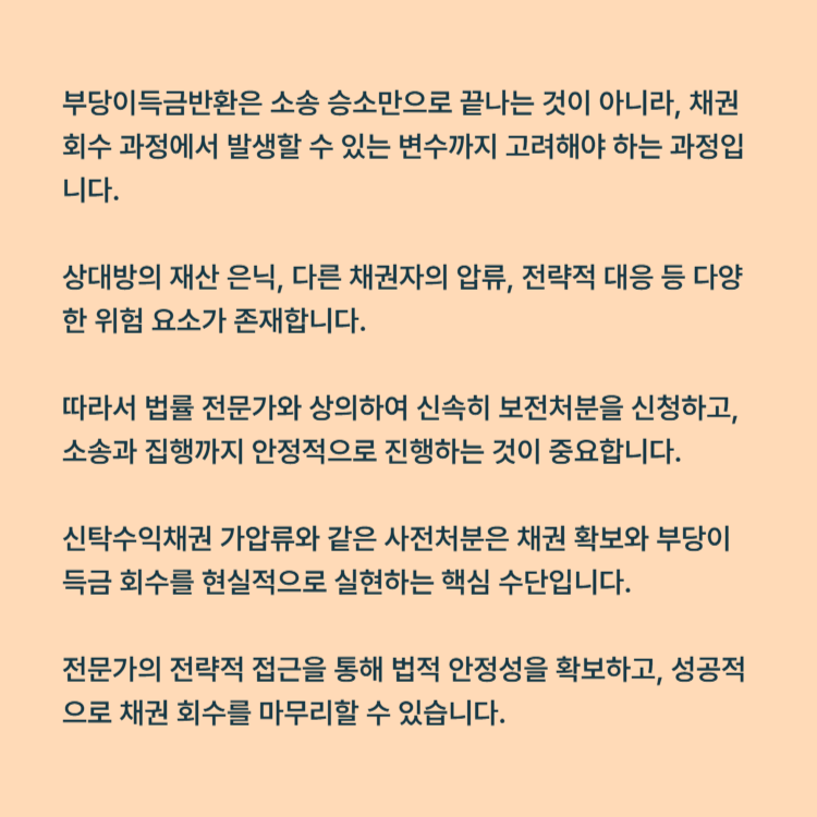 부당이득금반환은 소송 승소만으로 끝나는 것이 아니라, 채권 회수 과정에서 발생할 수 있는 변수까지 고려해야 하는 과정입니다. 상대방의 재산 은닉, 다른 채권자의 압류, 전략적 대응 등 다양한 위험 요소가 존재합니다.