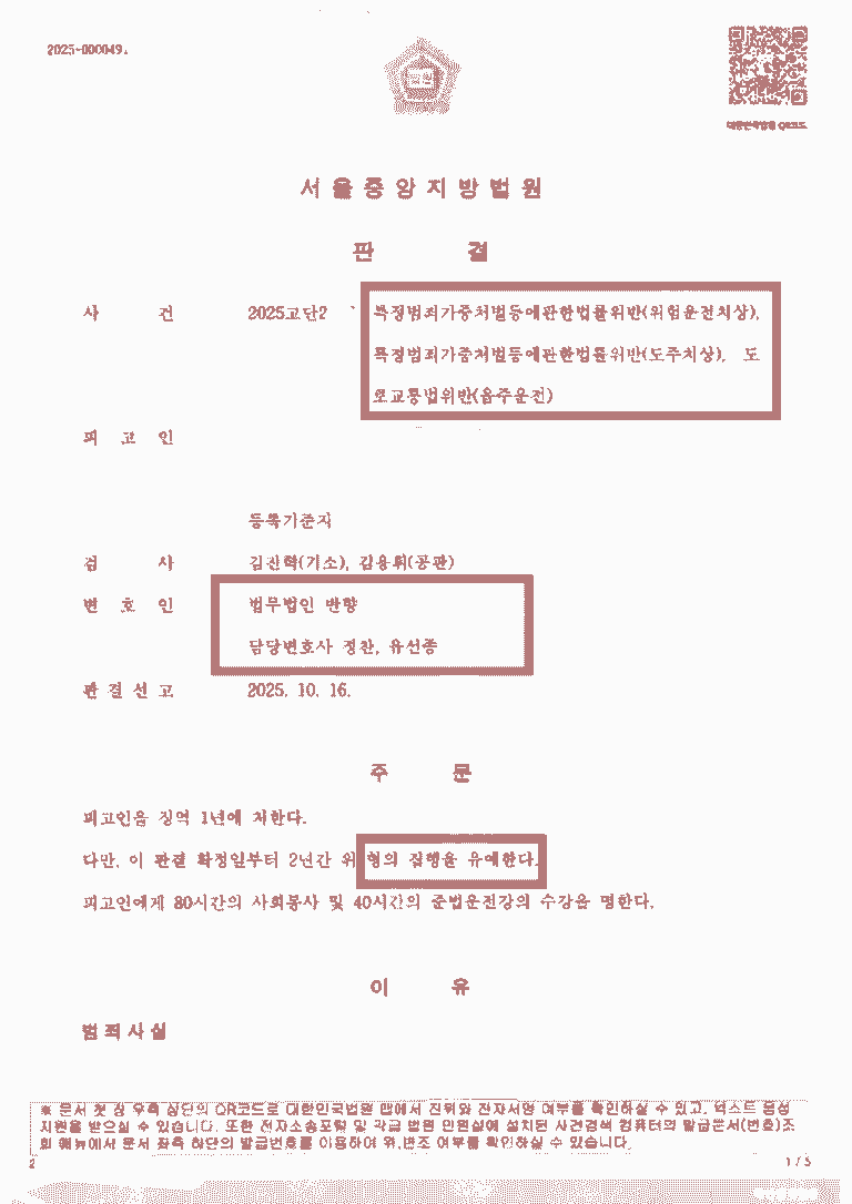 재판부는 사고 경위, 합의, 초범이라는 요소를 모두 고려해 실형 대신 징역형의 집행유예를 선고했습니다. 의뢰인은 구속을 피하고 정상적인 일상을 유지할 수 있게 되었습니다.