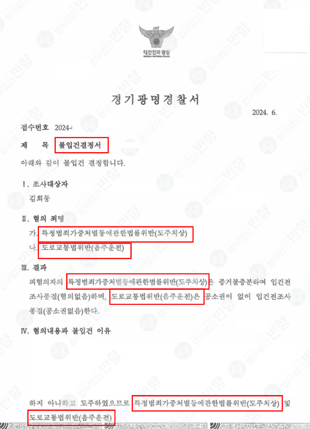 수사기관은 사고 인지 가능성, 피해의 정도, 합의 여부 등을 종합적으로 판단해 음주사고·도주·치상 혐의 모두 불입건으로 결정했습니다. 의뢰인은 정식 수사나 기소 절차 없이 사건에서 벗어날 수 있었습니다.