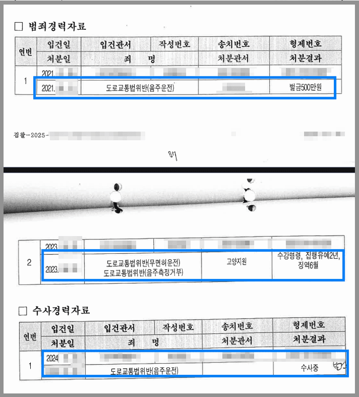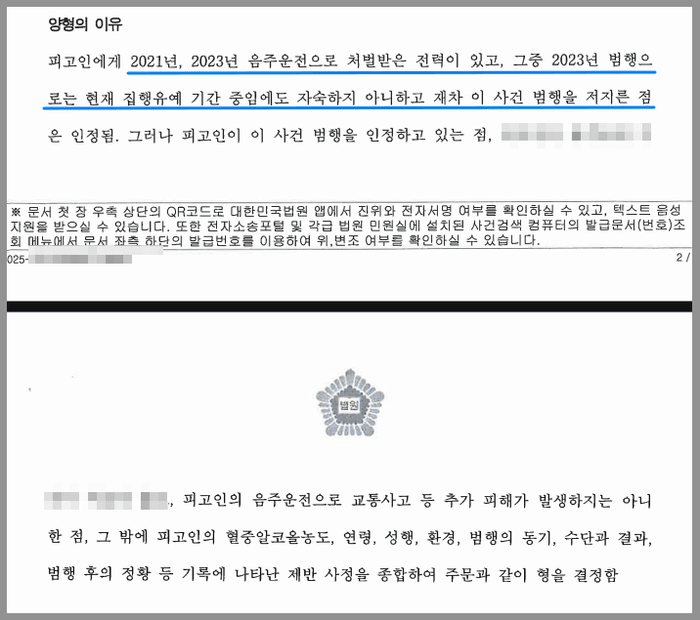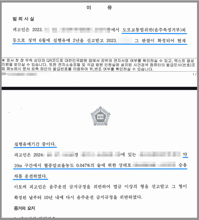 J는 2021년 음주운전죄로 벌금형을, 2023년에는 음주측정거부 및 무면허운전죄로 징역형의 집행유예를 선고받은 전력이 있었습니다. 그런데 그로부터 불과 1년이 조금 넘은 시점에 집행유예 기간 중 술에 취한 상태에서 운전을 하다가 주차장 내에서 잠이 들었고, 목격자의 신고로 단속이 되고 말았습니다.