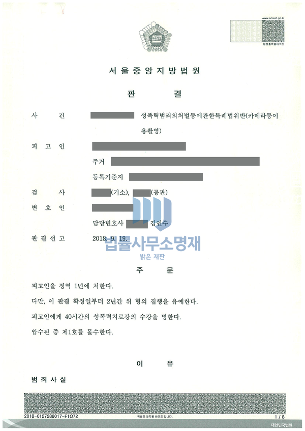 법원은 변호인이 주장한 정상을 참작하여 실형이 아닌 징역 1년, 집행유예 2년의 판결을 선고하였고, 신상정보 공개·고지 및 취업제한 명령은 면제되었습니다.