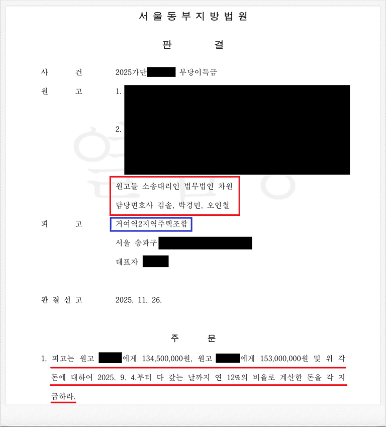 결국 재판부는 이러한 주장을 받아들여, 피고는 의뢰인들에게 각 억대의 분담금 및 이에 대한 지연손해금을 지급하라는 내용의 판결을 선고하였습니다.