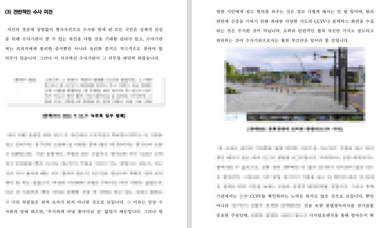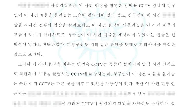 경찰과 검찰이 이 사건 과정에서 밀어붙인, 그리고 헌법소원이 제기된 후 제출한 의견서에서도 견지한 주장은 오직 하나, ‘가방을 가져가는 게 CCTV에 찍혔고 돌려놓는 것은 찍히지 않았다’ 이것뿐이었습니다. 이에 현장에 설치된 CCTV 모델을 확인한 결과, 해당 CCTV는 이른바 ‘회전형’으로, 계속 각도가 바뀌기 때문에 4~6분 이상의 여백이 생기게 된다는 것을 발견했습니다. 그럼에도 불구하고 수사기관은 다른 CCTV나 블랙박스 영상 등이 있는지 확인하지 않았고, 피의자의 휴대폰에 경찰서 구글 맵 검색기록이 있는지도 수사하지 않았습니다. 이러한 소홀한 수사와 ‘피의자 진술의 신빙성’은 기소유예 처분의 직접적 근거가 되었고 그 자체가 기본권 침해의 핵심 사유가 되었습니다.