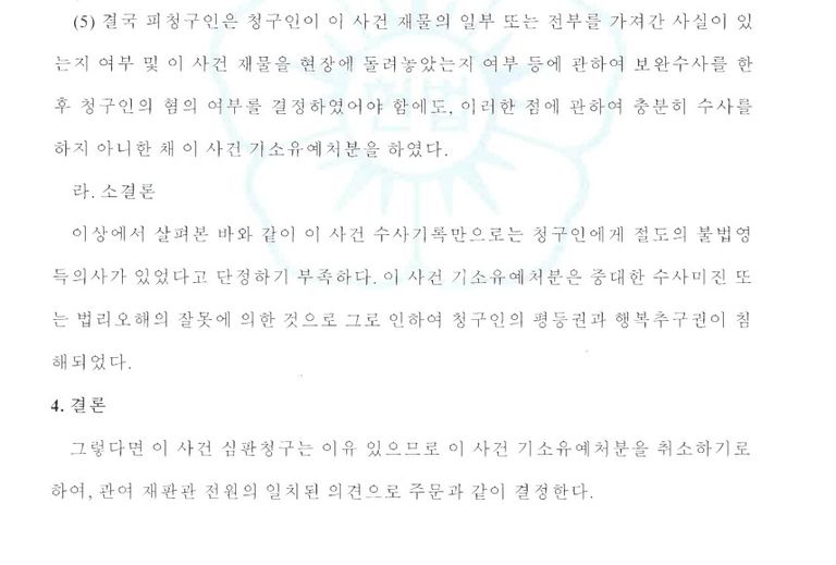 “청구인에게는 불법영득의사를 인정할 만한 어떠한 증거도 없음에도, 수사기관은 부실한 조사와 자의적 판단으로 기소유예를 하였고 이는 헌법 제10조(행복추구권), 제11조(평등권)을 중대하게 침해한다.”는 것이 주장의 요지였습니다.