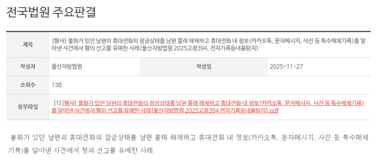 남편의 외도를 의심하여 휴대전화를 몰래 열어본 아내에게 유죄가 인정된 울산지방법원 판결(2025고정394)은