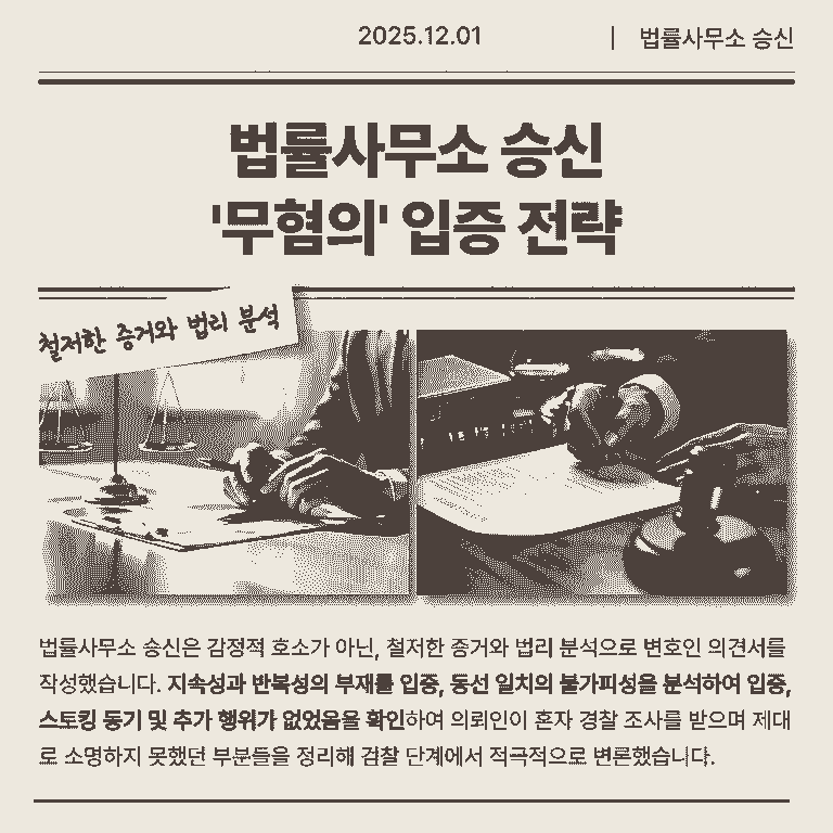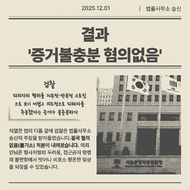 법률사무소 승신의 조력을 통해 결국 '혐의없음(불기소)' 처분을 받아내셨습니다.