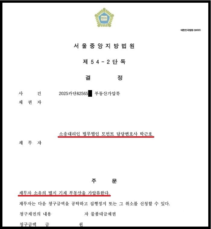 의뢰인은 상대방 주요 부동산에 가압류 결정을 받아 채권회수 가능성을 높이기 위해, 저를 찾아 주셨습니다.