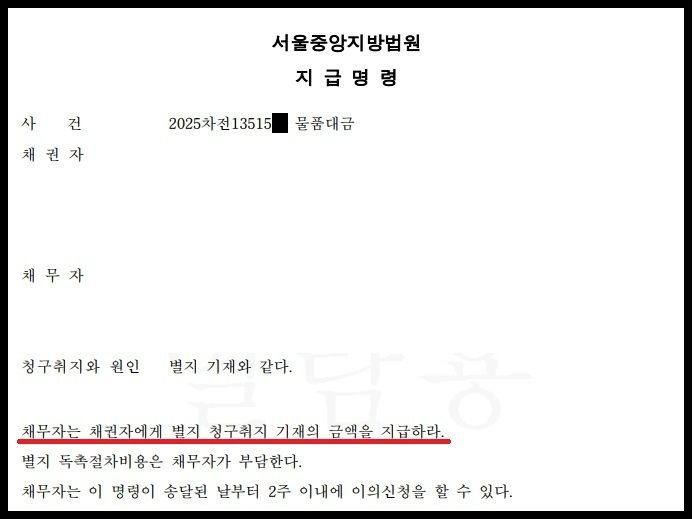 ※ 지급명령은 신속성이 생명이며, 변호사가 정말로 완벽하게 업무처리를 해야만 하루만에 지급명령이 날 수 있습니다.
