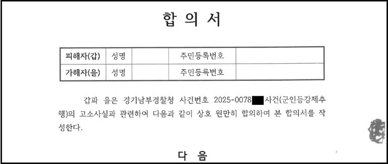 또항 가해자에게 합의금 제안을 할 당시 상대방이 금액에 대해 다투지 못하도록 정확한 근거를 제시하였고, 합의금 협상 및 합의서 문구 정리도 완벽하게 조력하였습니다.