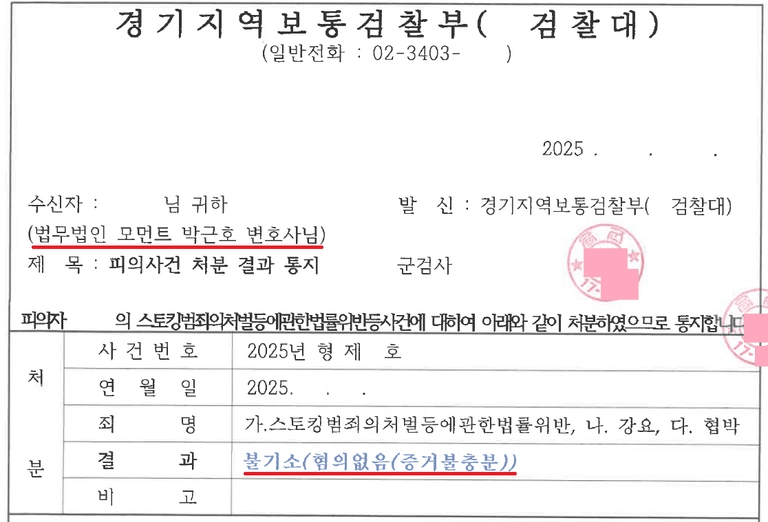 스토킹, 협박, 강요 전부 무혐의 성공사례