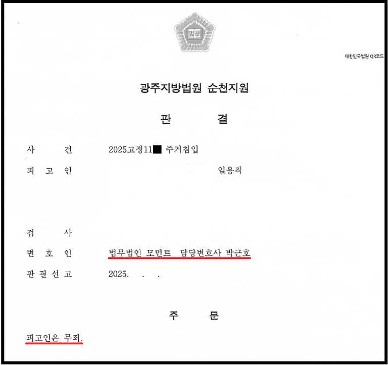 ※ 실제 주거침입죄 약식명령에 대하여 정식재판을 청구하고, 사실관계 및 법리의 모든 측면에서 처절한 변론을 개진하여 무죄 판결을 받는 것은 정말 어려운 일입니다.