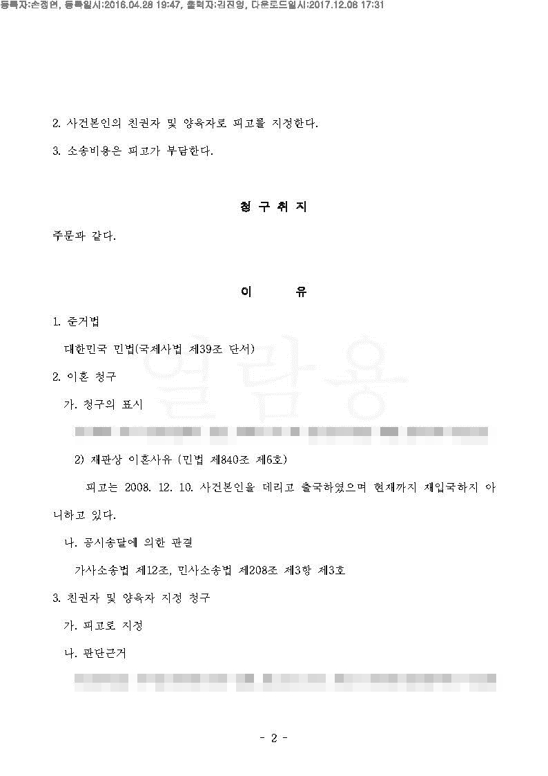 사건 개요 : 이 사건은 이혼 사건으로 외국인인 의뢰인의 부인(피고)이 사건본인(자녀)를 데리고 필리핀으로 도망가 연락이 수년간 되지 않아 이혼소송 을 의뢰하였습니다. 이번 케이스는 피고가 외국에 있기 때문에 소송자체가 진행에 어려움이 있었습니다.