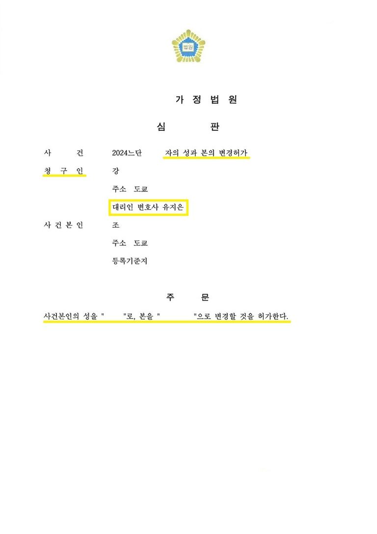 당사자 전원이 국내에 입국한 사실이 없어 기본서류 발급부터 당사자 특정에 어려움이 있었지만 자녀의 복리를 위해 딸의 성과 본을 친부에서 계부로 변경할 필요성이 있음을 강조하였고, 친부와 계부 모두의 동의를 받고 특별영주자증명서 및 서명확인서를 번역 공증 및 아포스티유 확인을 받아 법원에 제출하였습니다.
