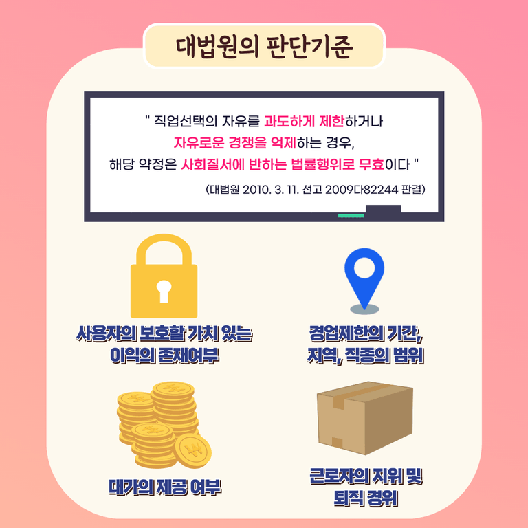 즉, 핵심은 '보호할 가치 있는 이익의 존재' 와, '경업금지 기간과 범위' 입니다.