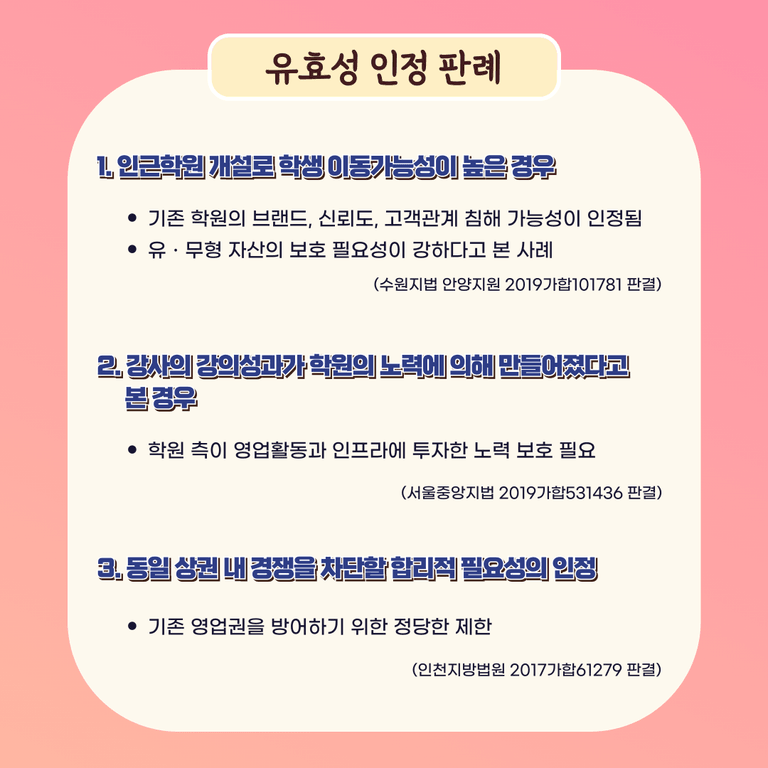 기존 학원의 브랜드와 신뢰도, 고객관계의 침해 가능성을 인정하고 학원의 유형, 무형 자신의 보호 필요성이 강다하고 본 사례에서 경업금지약정의 유효성을 인정했습니다.