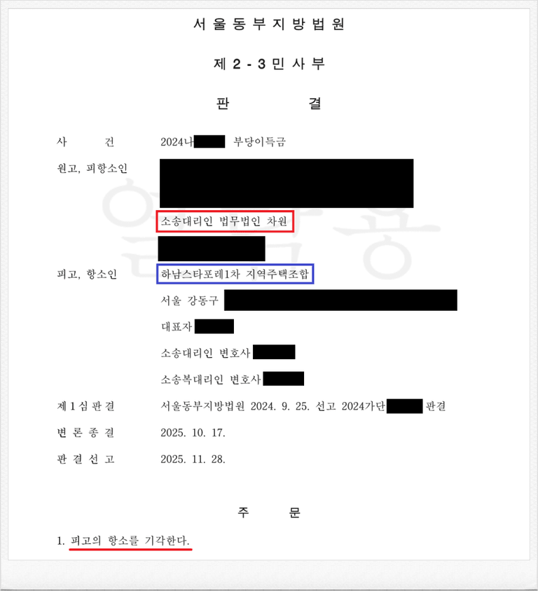 그럼에도 불구하고 피고 하남스타포레1차 지역주택조합은 제1심 판결에 불복하여 항소를 제기하였습니다.
