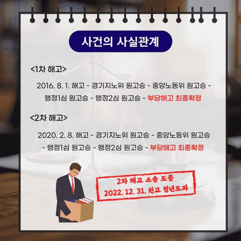 원고는 다시 노동위 및 행정소송을 거쳐 부당해고 판결을 받았으나, 그 과정에서 2022년 말 정년이 도래했습니다.