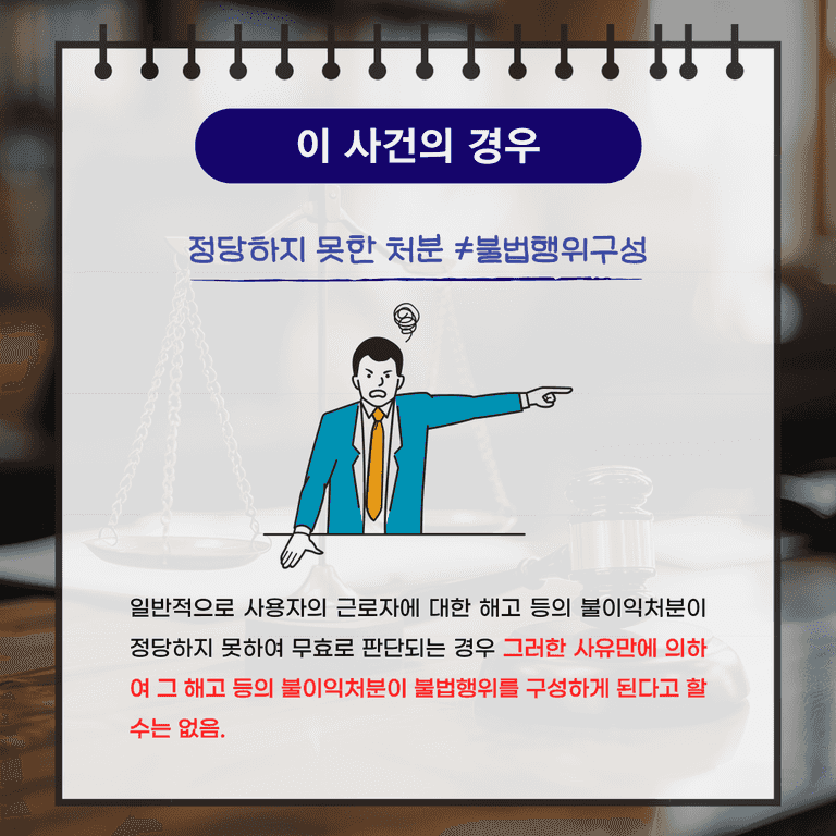 A. 일반적으로 사용자의 해고가 정당성을 잃어 무효가 되었다고 해서, 곧바로 불법행위가 성립하는 것은 아닙니다.