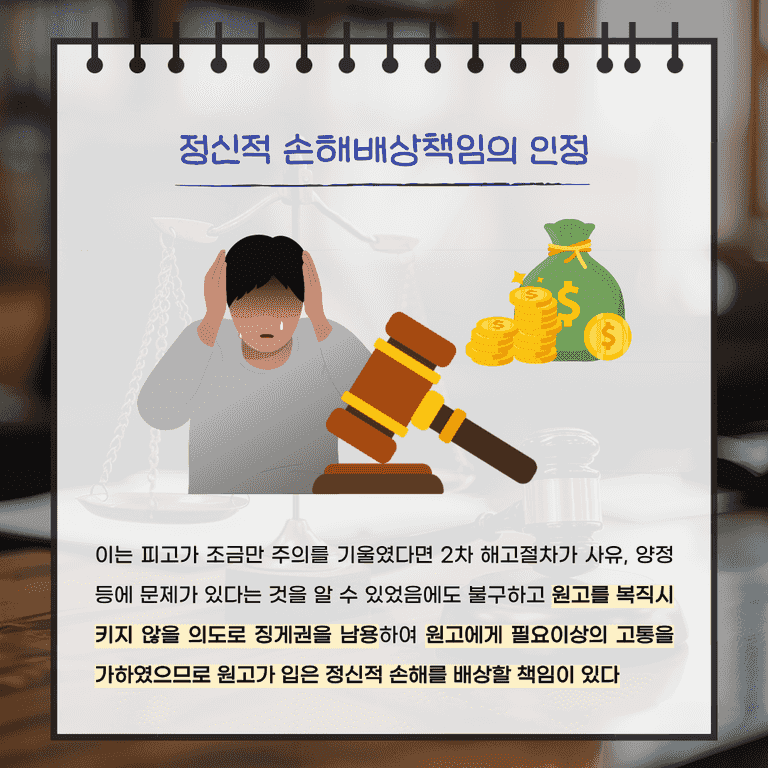 이는 부당해고 피해 근로자가 임금 청구를 넘어 정신적 손해배상까지 청구할 수 있다는 점을 인정한 판례로서 중요한 의미를 가집니다.