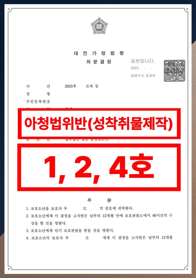 검찰은 본 사건을 소년보호사건으로 처리하도록 송치했고, 대전가정법원은 1호 보호자 감호 위탁, 2호 수강명령, 4호 단기 보호관찰의 처분을 결정했습니다. 즉, 소년원 송치나 형사처벌 없이 교육적 회복 기회를 얻을 수 있었던 사례였습니다.