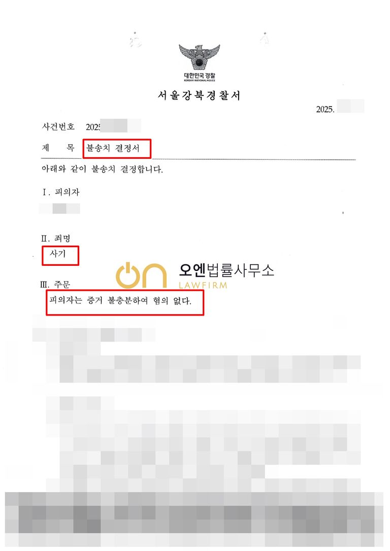 수사기관은 담당변호사의 주장을 받아들여, 의뢰인에 대해 혐의가 없다고 판단하여 불송치하였습니다.