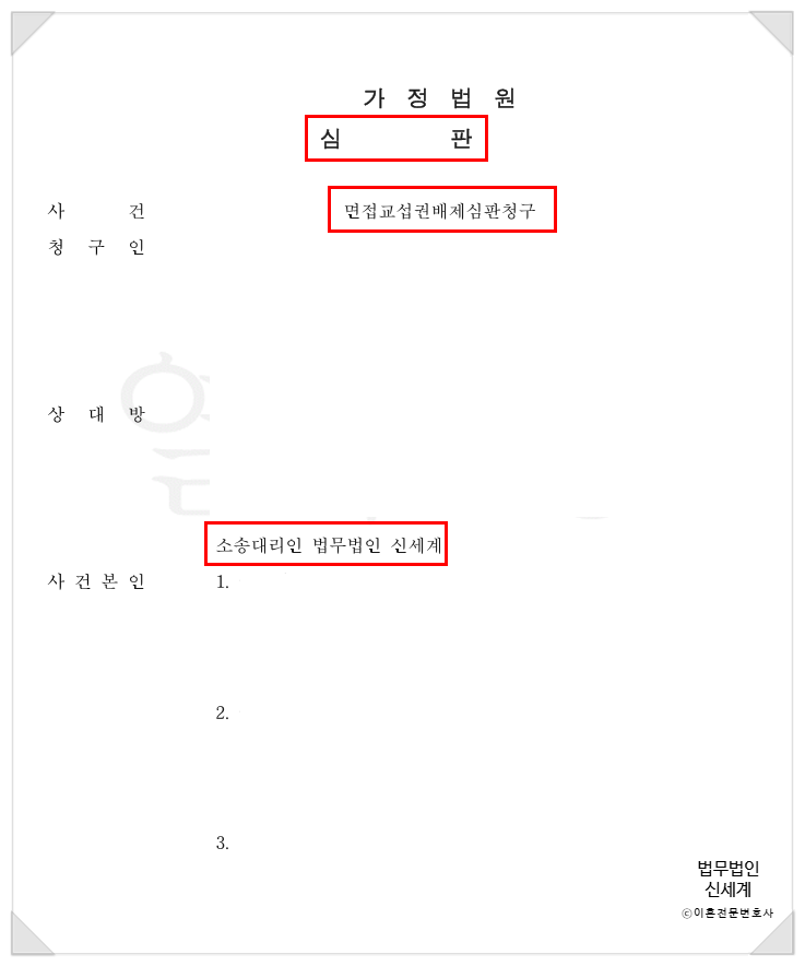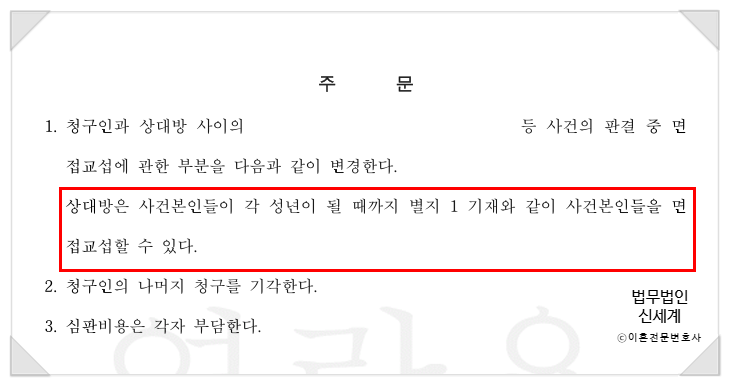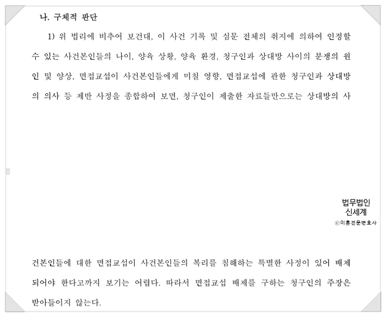 법무법인 신세계에서는 상대방을 대리하여 면접교섭이 계속될 수 있도록 하는 방어 소송을 진행하였습니다.