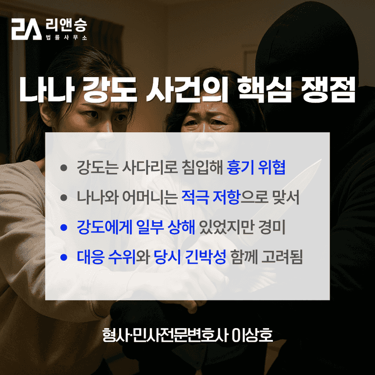 사건의 심각성뿐 아니라, 나나 정당방위가 인정된 과정에서 정당방위 법리가 어떻게 적용되는지 논쟁이 이어지고 있습니다.