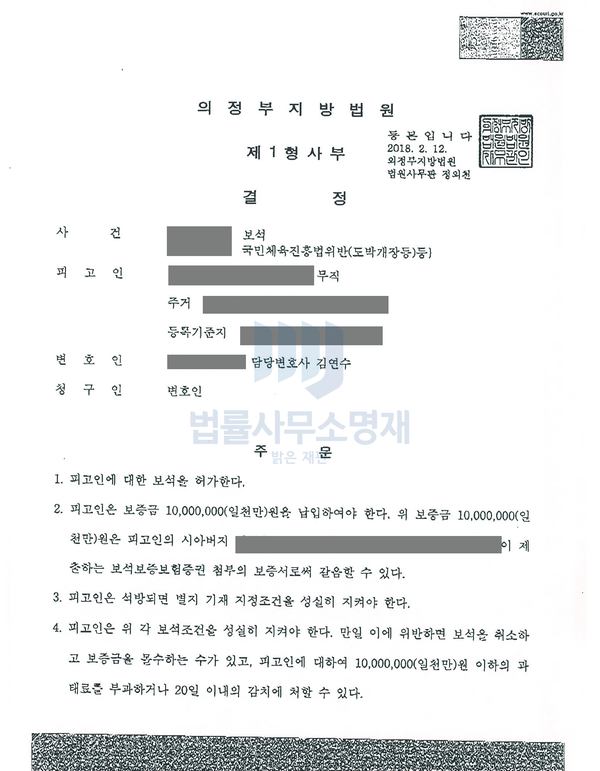 저는 의뢰인의 도박개장 혐의를 인정하는 것과 별개로, 의뢰인이 필요적 보석의 요건을 갖추었다는 점을 법률적으로 설명하면서 동시에 의뢰인이 계속 구속되어 있으면 어린 자녀를 양육할 사람이 없다는 점을 재판부에 호소하였습니다.