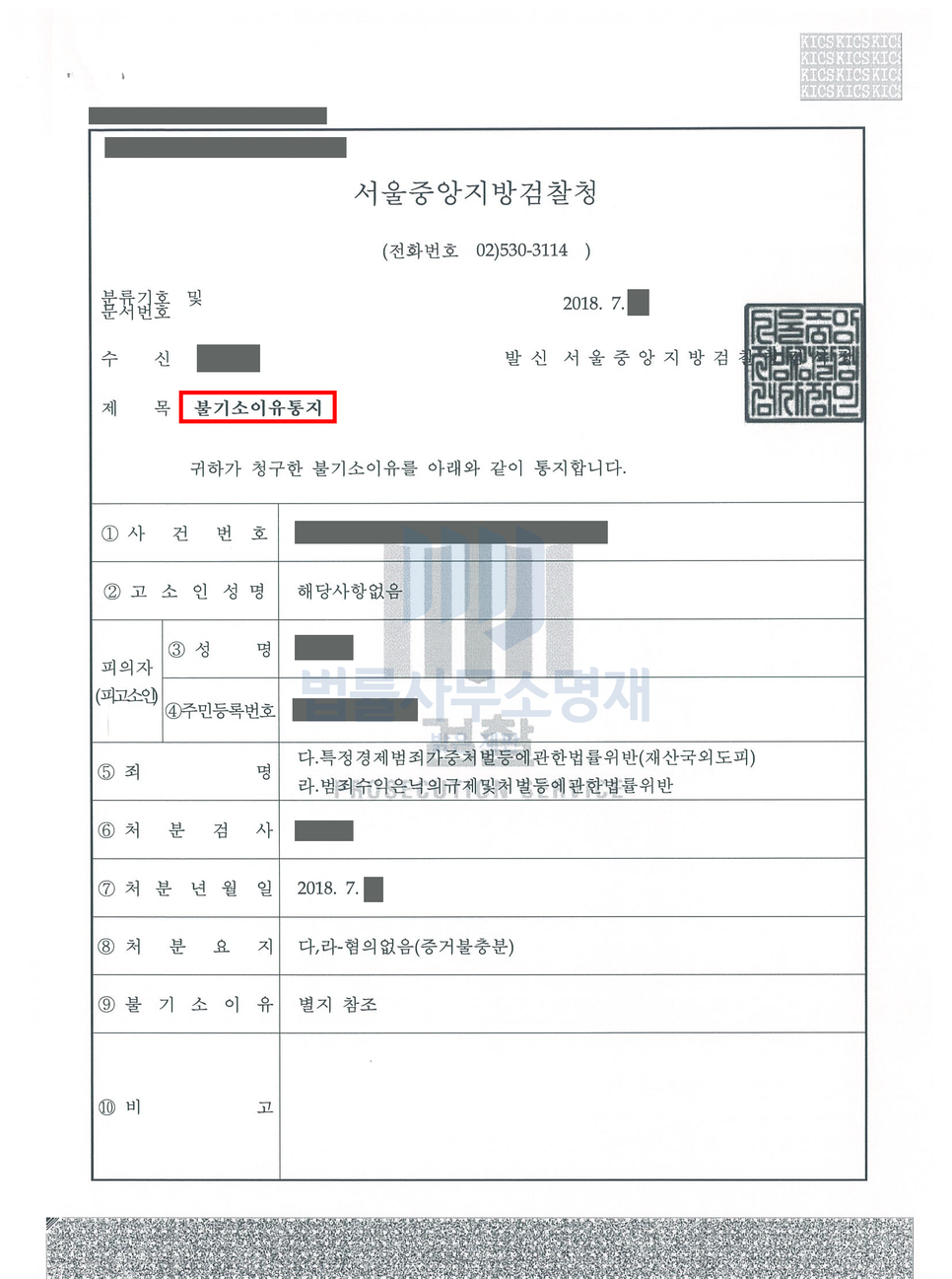 검찰은 의뢰인에 대한 특경법 위반(재산국외도피) 및 범죄수익은닉 혐의에 대해 최종적으로 무혐의처분(증거불충분)을 하였습니다. 만일 혐의가 인정되었다면 재산국외도피를 이유로 5년 이상의 유기징역, 범죄수익은닉을 이유로 5년 이하의 징역 및 13억 원에 대한 몰수가 가능하였기 때문에 의뢰인은 큰 위기를 모면할 수 있었습니다.