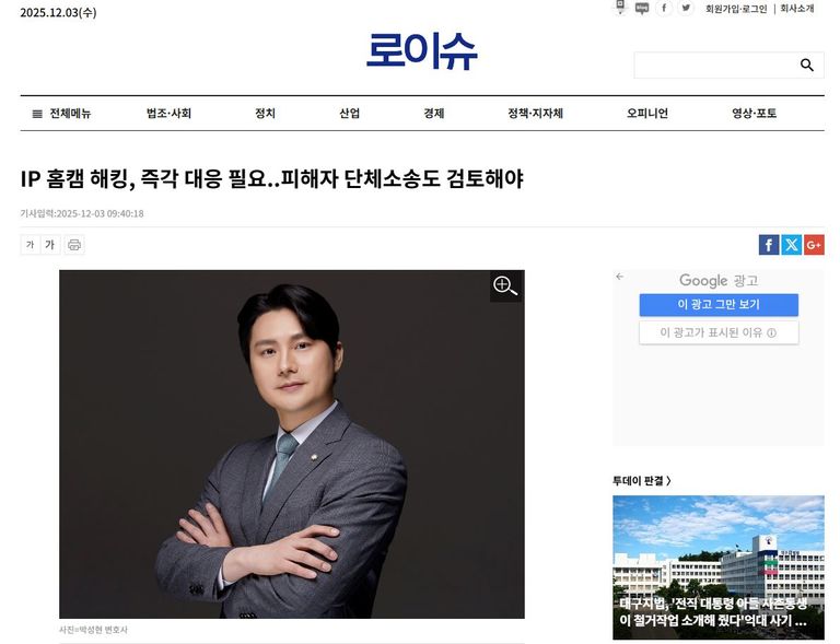 마지막으로 박성현변호사는 “IP캠 해킹 사건은 법률적 대응과 기술적 점검, 대외 커뮤니케이션이 동시에 맞물려야 피해 확산을 막을 수 있는 사건”이라며 “초기 대응 전략을 제대로 세우지 못하면 피해가 걷잡을 수 없이 확대되는 만큼, 해킹이 의심되는 단계에서 즉시 전문가 조력을 받는 것이 피해 통제의 최선”이라고 강조했다.