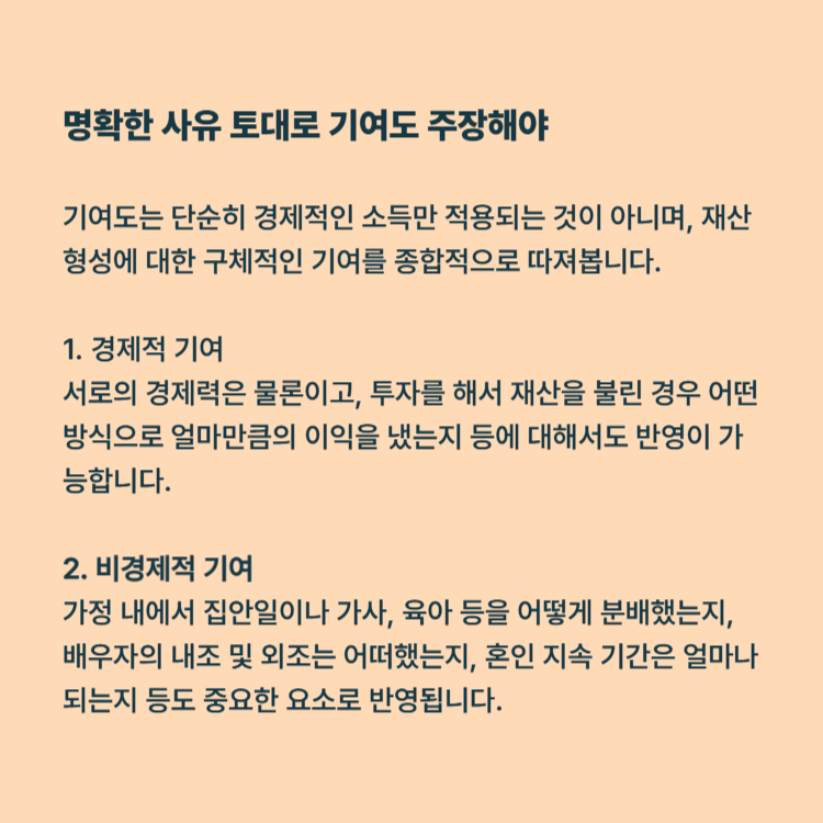 비경제적 기여: 가정 내에서 집안일이나 가사, 육아 등을 어떻게 분배했는지, 배우자의 내조 및 외조는 어떠했는지, 혼인 지속 기간은 얼마나 되는지 등도 중요한 요소로 반영됩니다.
