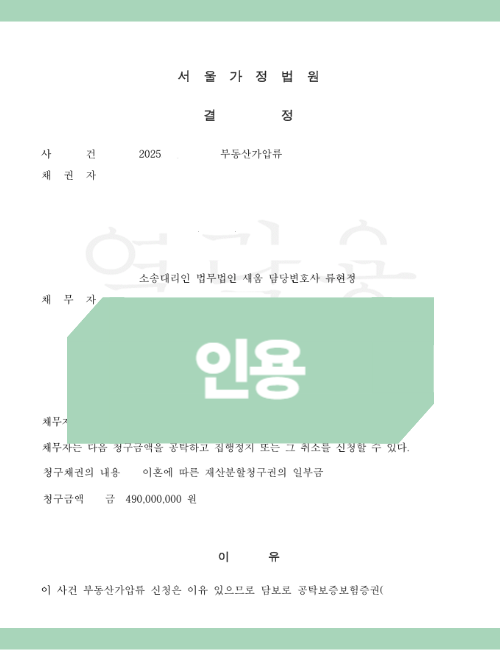 가압류/가처분(보전처분)의 역할: 이러한 보전처분의 대상이 되는 재산이나 권한은 채무자(상대방 배우자)가 마음대로 사용하거나 처분할 수 없도록 동결됩니다. 이를 통해 청구금액이 소송 기간 동안 안전하게 보전될 수 있습니다.