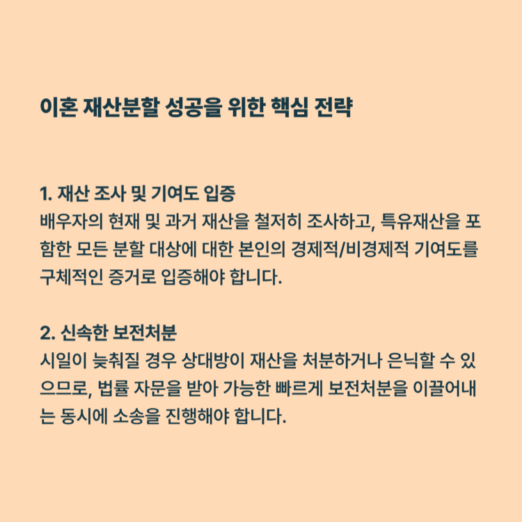재산 조사 및 기여도 입증: 배우자의 현재 및 과거 재산을 철저히 조사하고, 특유재산을 포함한 모든 분할 대상에 대한 본인의 경제적/비경제적 기여도를 구체적인 증거로 입증해야 합니다.